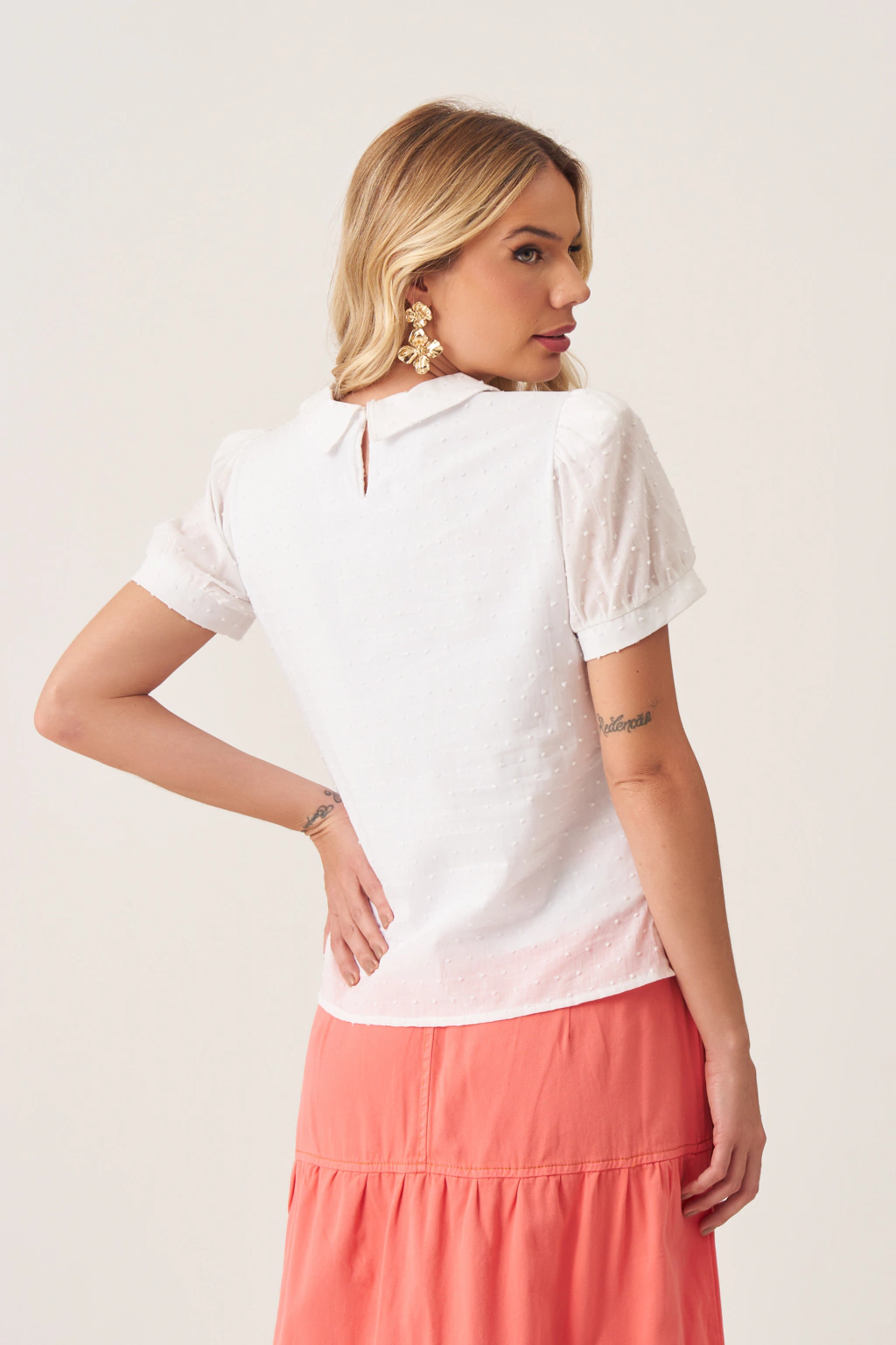 A blusa é uma peça que evoca uma estética encantadora e refinada, destacando-se por sua silhueta clássica e detalhes delicados. O tecido adiciona uma textura suave e um caimento elegante.