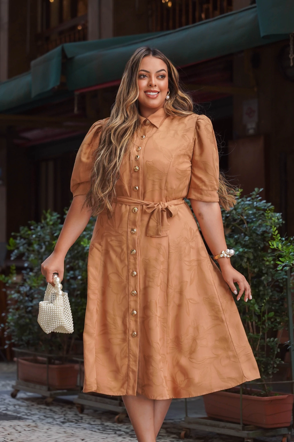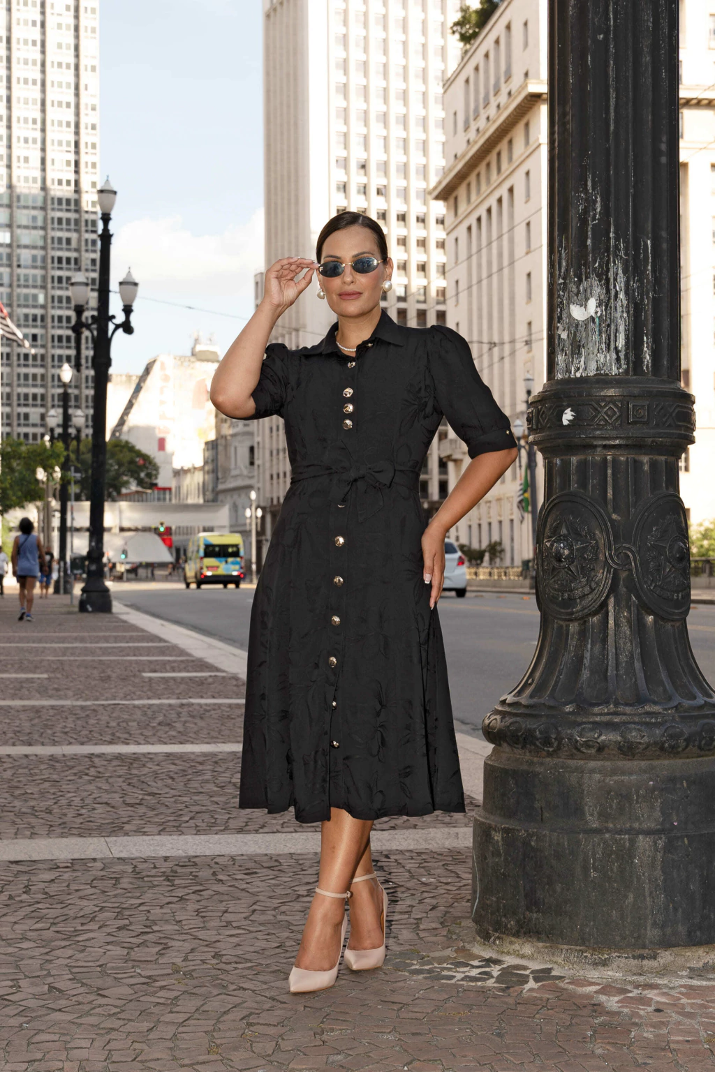 Este vestido chemise de viscose texturizada traz um charme clássico com sua modelagem evasê e comprimento midi. As mangas 3/4 e a gola clássica conferem um toque sofisticado e atemporal, enquanto o cinto faixa realça a cintura e proporciona um ajuste perfeito. O fechamento por botões na parte frontal e o forro garantem conforto e praticidade, tornando a peça ideal para diversas ocasiões.