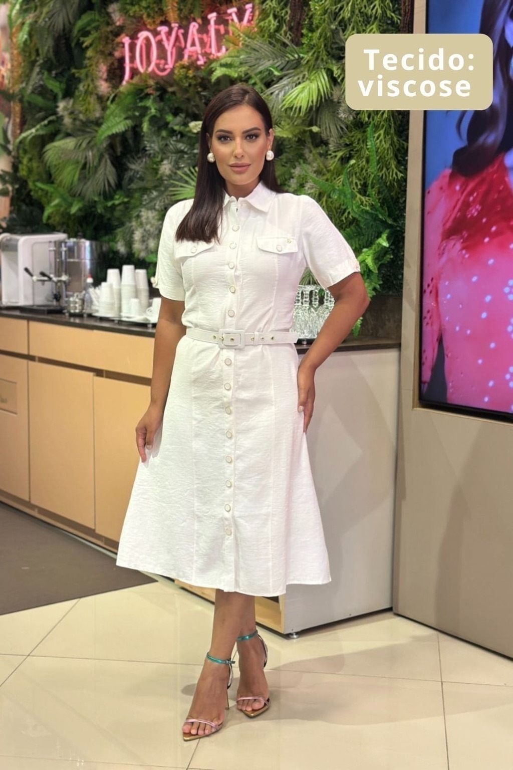 Com modelagem evasê e comprimento mídi, ele valoriza a silhueta com leveza e sofisticação. As lapelas frontais com botões adicionam charme e um toque utilitário refinado, enquanto as mangas curtas com detalhes diferenciados conferem um ar contemporâneo e delicado. O vestido acompanha forro, garantindo conforto, e cinto estruturado com fivela quadrada que destaca a cintura com estilo.