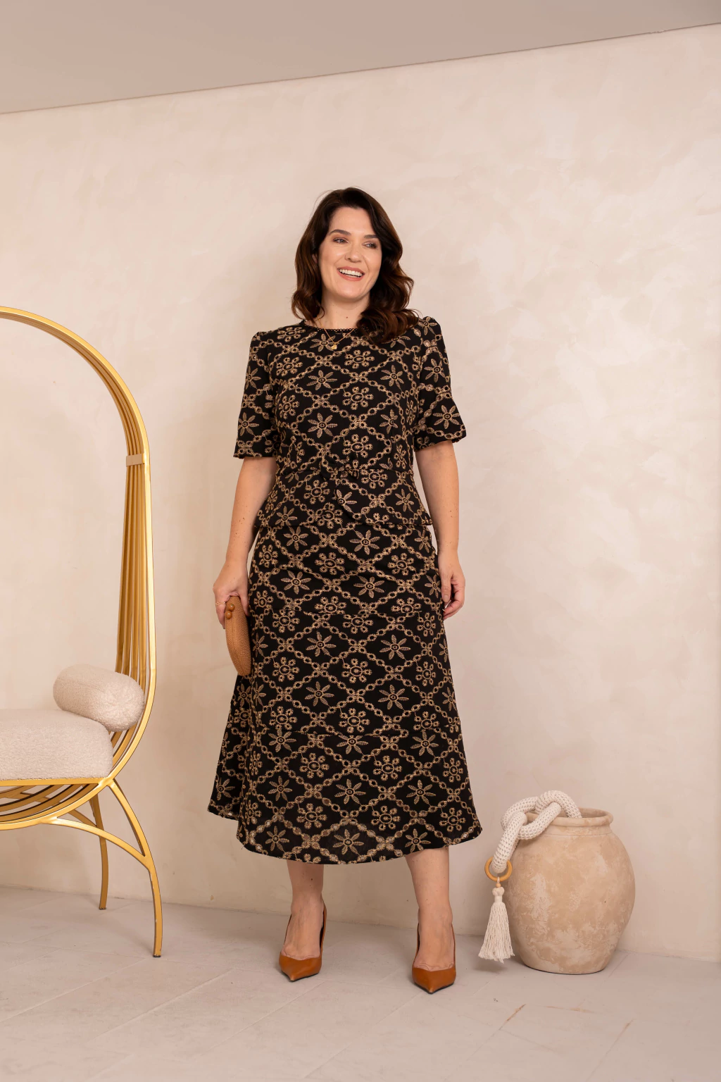 O conjunto Ariadne é a combinação perfeita entre delicadeza e elegância. A blusa, com modelagem peplum, destaca a cintura com charme, enquanto o detalhe em laço na frente e a renda guipir no decote trazem um toque romântico e sofisticado. As mangas princesa complementam o visual com volume e feminilidade, e o fechamento em zíper nas costas garante praticidade. A saia evasê completa o conjunto com um caimento fluido e elegante, também com fechamento em zíper nas costas para melhor ajuste.