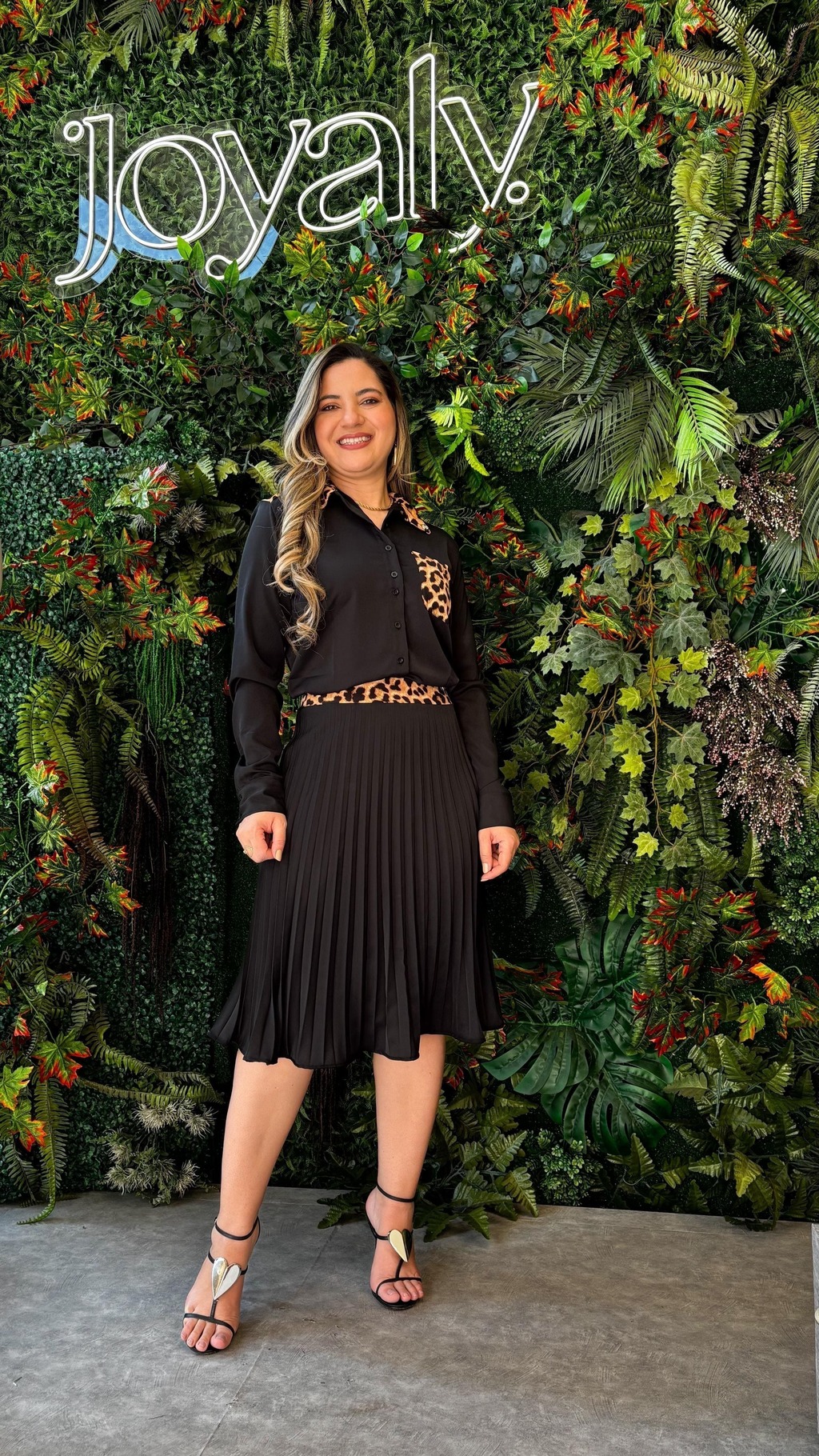 A saia plissada de comprimento mídi segue a mesma proposta sofisticada. Com movimento fluido e leveza no caimento, ela conta com cós em animal print que harmoniza com os detalhes da camisa, criando um conjunto coeso e cheio de estilo. O fechamento lateral em zíper é discreto, e o forro garante conforto e segurança ao vestir.