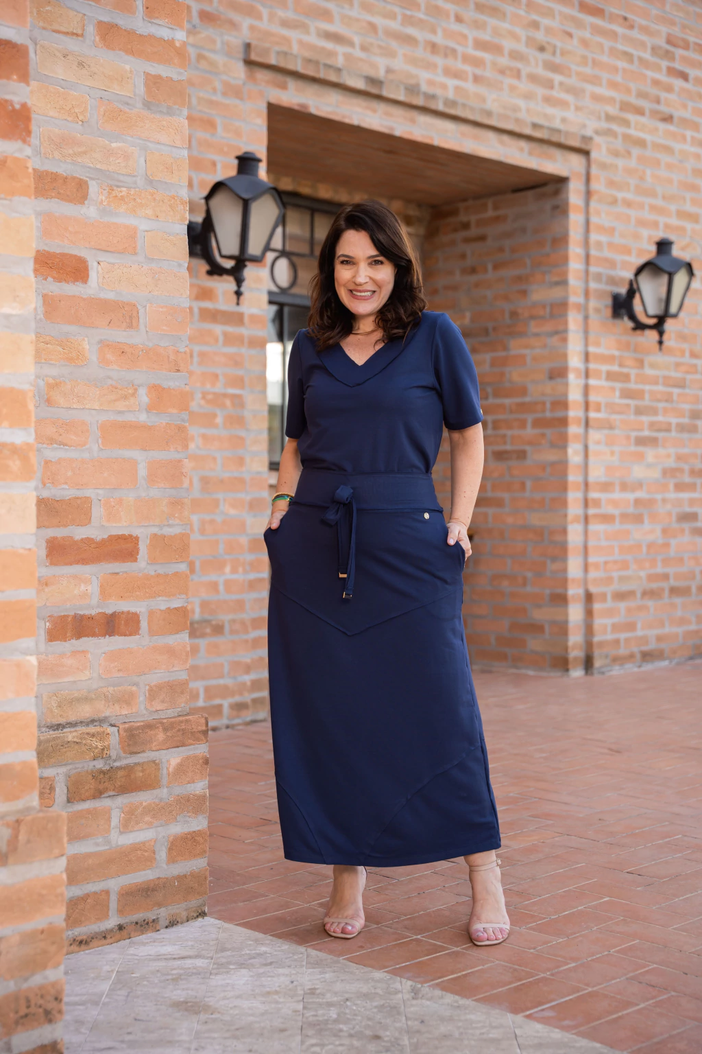 Leve e versátil, o conjunto Priscila traz um visual descomplicado com toque de sofisticação. A blusa de modelagem ampla tem decote em V, mangas curtas e delicadas fendas laterais que garantem caimento solto e confortável. A saia midi evasê complementa a composição com cós ajustável por elástico nas costas, faixa fixa com ponteiras diferenciadas e pespontos com costura sobreposta, além de bolsos funcionais que unem praticidade e estilo.