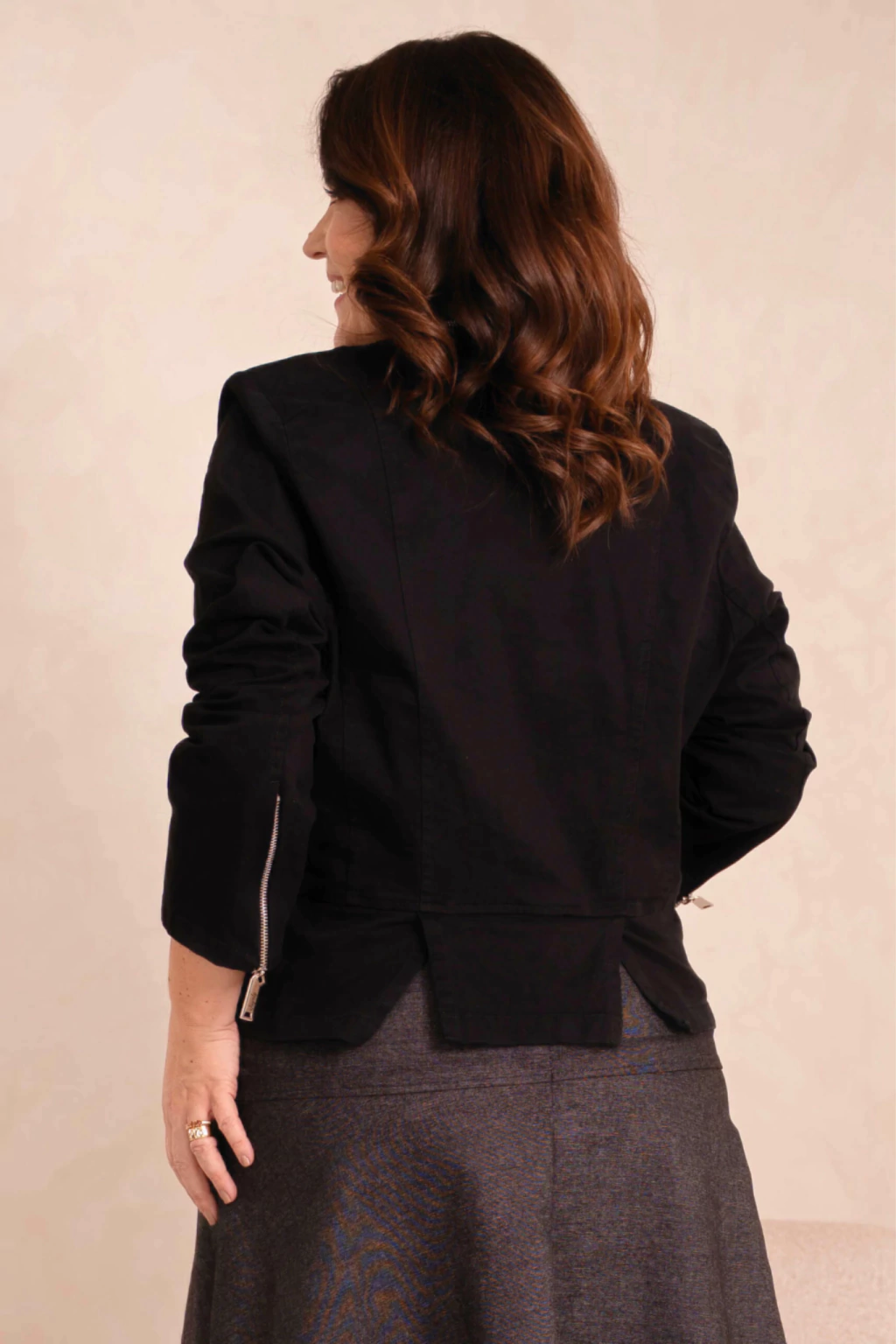 A jaqueta Alice é uma peça cheia de atitude e estilo, ideal para compor looks modernos com um toque urbano. Confeccionada em sarja preta, possui modelagem ajustada ao corpo, valorizando a silhueta feminina. As mangas longas e os detalhes em zíper de enfeite na parte frontal e na gola conferem um visual contemporâneo e marcante. Sem fechamento frontal, a peça tem um design clean e versátil, perfeita para sobreposições.