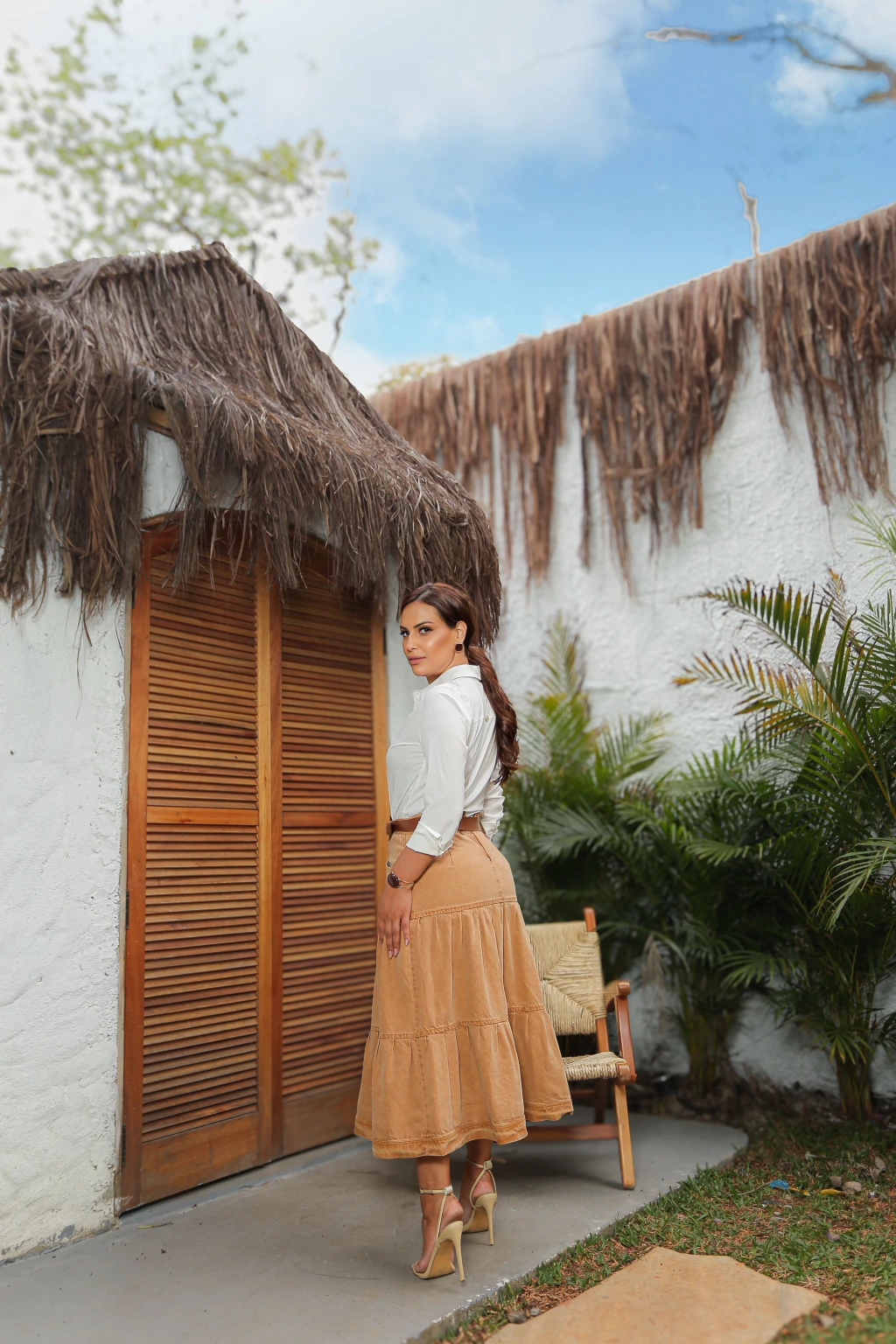 A Saia Midi Jeans Jordana é a peça que une conforto e estilo com um toque rústico e moderno. Com modelagem evasê e midi, ela apresenta um design único com três camadas em babados que proporcionam um movimento leve e elegante. Os botões frontais adicionam um charme extra, enquanto os bolsos faca trazem praticidade.