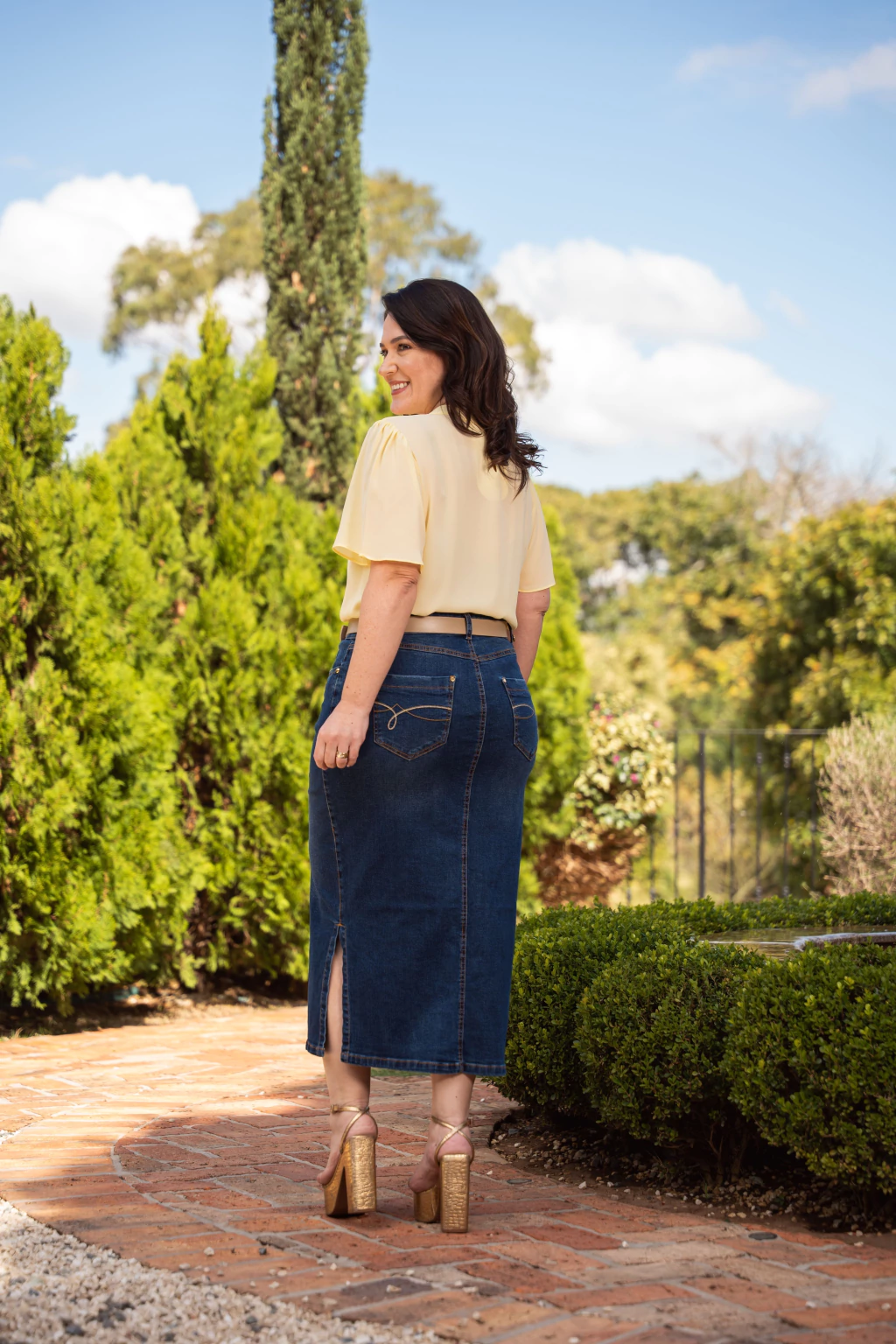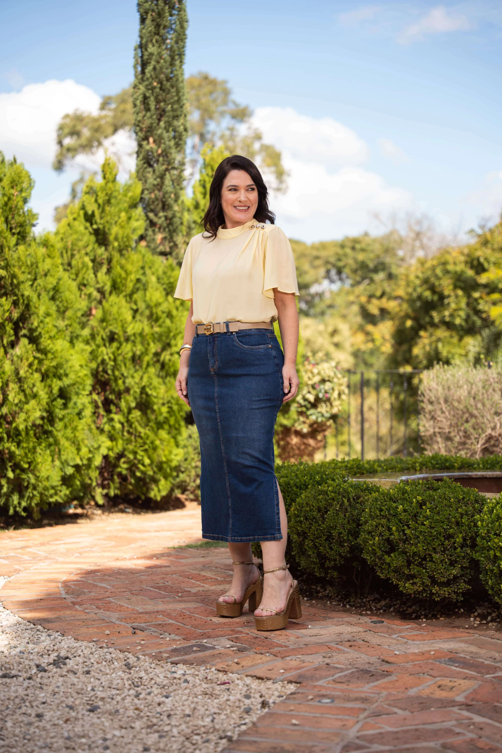 A Saia Jussara é uma peça versátil e elegante, com comprimento midi e modelagem reta que proporciona um caimento sofisticado. As fendas laterais garantem movimento e um toque moderno, enquanto o fechamento em zíper por braguilha com abotoamento assegura praticidade. Os bolsos frontais e traseiros funcionais, estes últimos com delicados bordados, unem estilo e funcionalidade. Acompanha cinto personalizado, que valoriza a cintura e complementa o visual.
