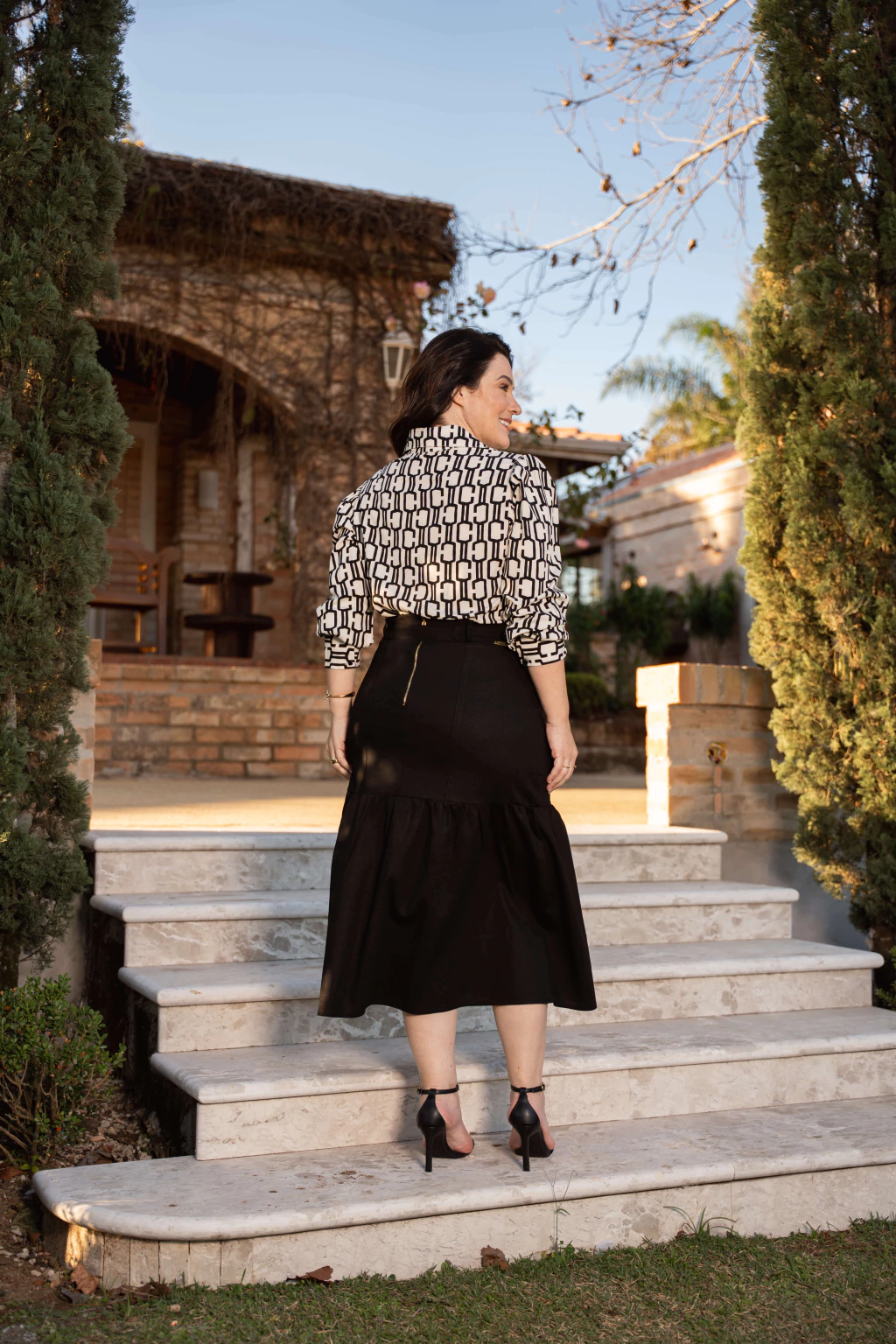 A saia Laura midi evasê combina delicadeza e modernidade em seu design único, realçado pelos recortes frontais que trazem movimento e personalidade à peça. O cós fino com passantes e faixa para amarração valoriza a cintura com charme sutil, enquanto o zíper de metal dourado nas costas adiciona um toque sofisticado ao acabamento.