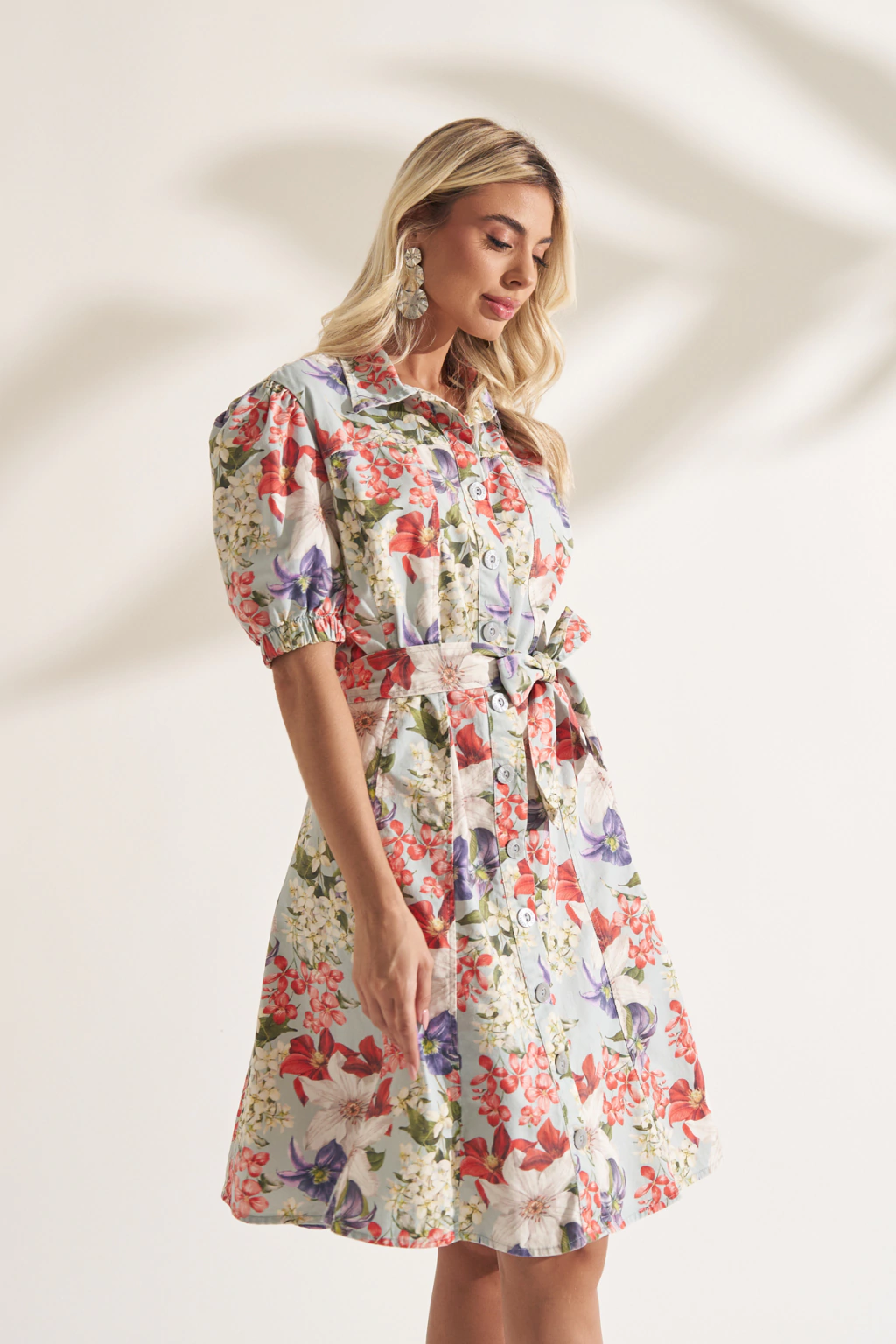 Para um look casual diurno, opte por sapatilhas ou tênis brancos, destacando a leveza do vestido. Se desejar adicionar um toque mais sofisticado, combine-o com sandálias de salto e acessórios delicados, como um colar ou brincos simples. A cintura marcada do vestido acrescenta um toque de feminilidade, enquanto a estampa floral eleva o visual, tornando-o perfeito para passeios descontraídos, encontros casuais ou eventos ao ar livre.