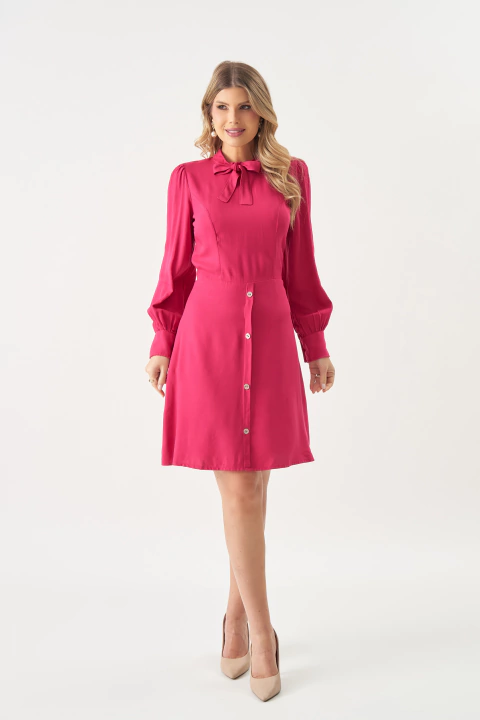 Vestido curto com mangas longas e detalhes franzidos nos ombros. Possui gola laço que agrega um charme especial ao look. Vista fake com botões na saia, conferindo um toque clássico e elegante. Confeccionado em tecido leve e fluido, é ideal para eventos casuais e sofisticados, garantindo conforto e estilo. Perfeito para ocasiões que exigem um visual feminino e moderno.