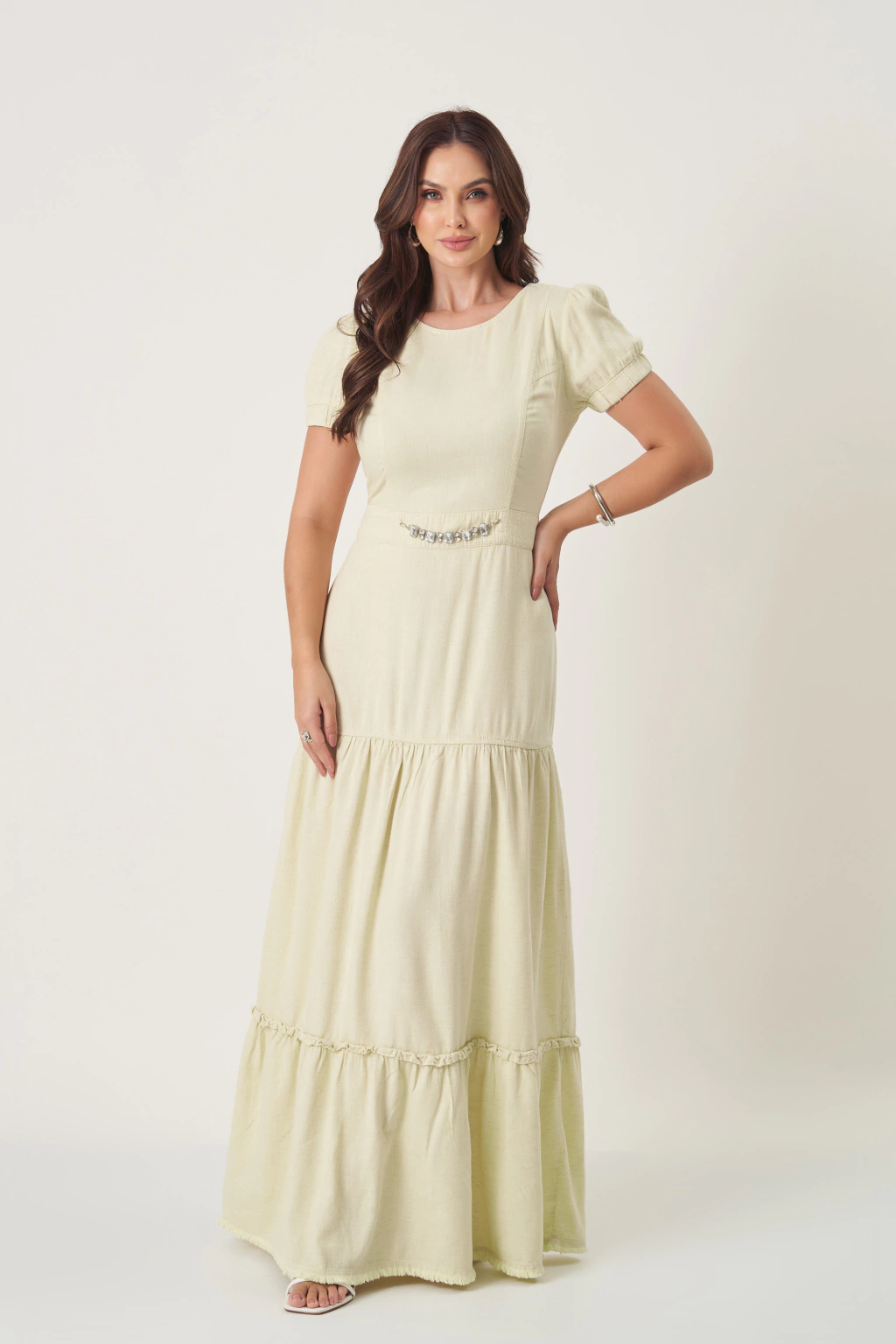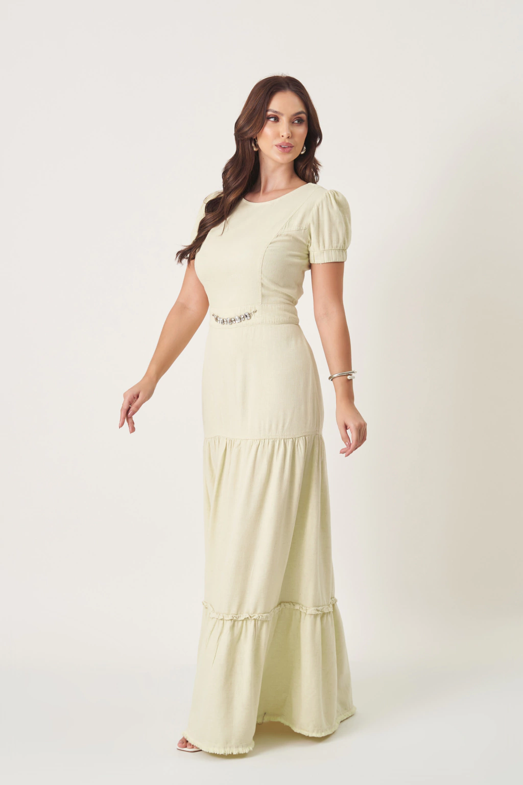 Vestido longo de modelagem evasê, com recortes que trazem movimento e leveza ao visual. O decote redondo e as mangas curtas bufantes acrescentam delicadeza, enquanto a aplicação de pedraria removível na cintura oferece um toque de glamour e versatilidade. O barrado desfiado completa o design com uma proposta contemporânea e charmosa. Fechamento por zíper nas costas.