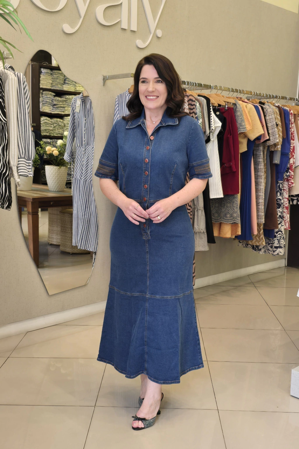 Esse vestido mídi com modelagem evasê traz uma vibe delicada e confortável, destacando-se pelos detalhes como a meia vista com botões personalizados, a gola clássica de camisa e as mangas curtas com bordados que adicionam um toque feminino e especial à peça.