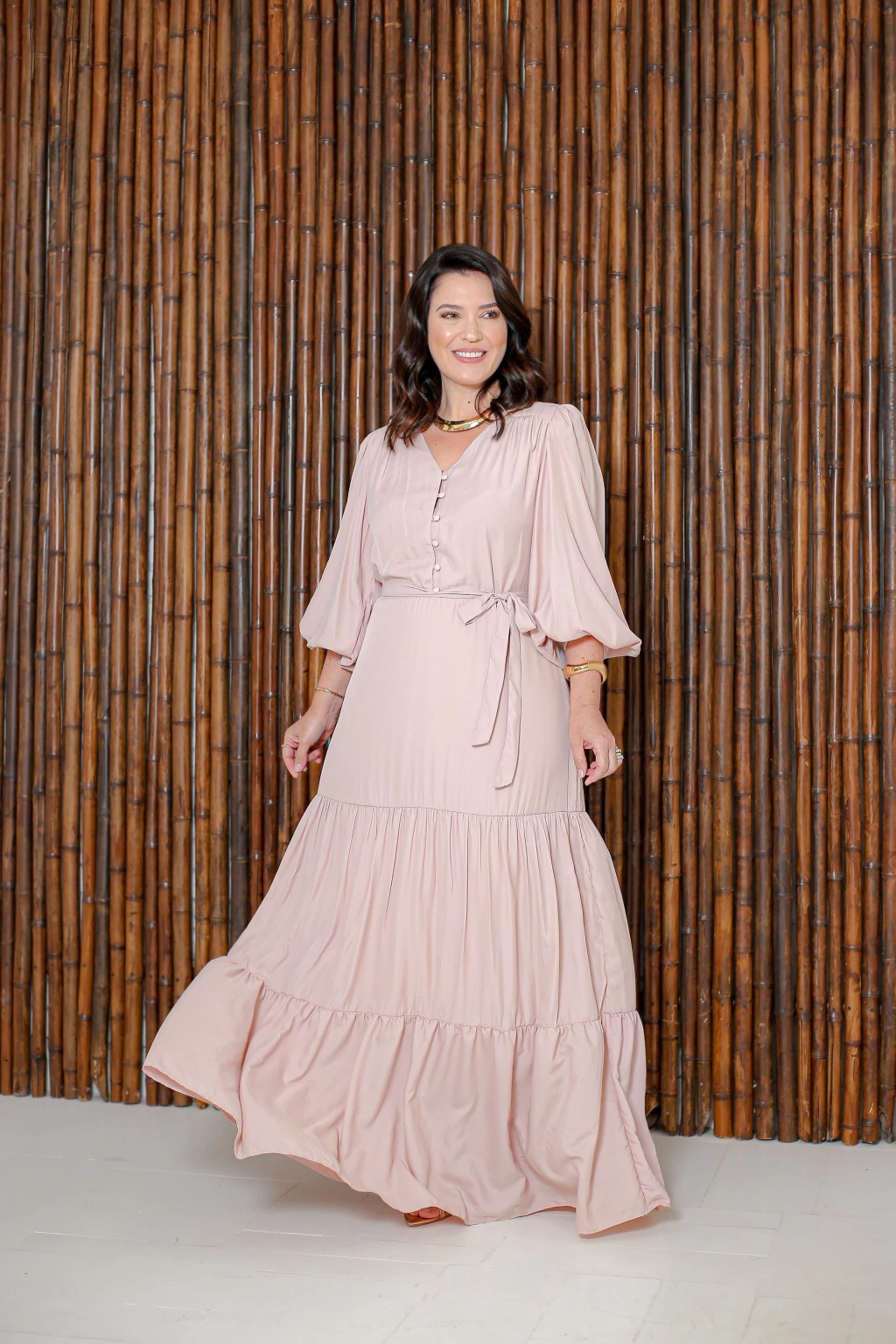 O Vestido Nicole é um clássico moderno, perfeito para quem ama leveza, movimento e romantismo. Confeccionado em tecido fluido com toque suave, ele traz modelagem longa com recortes delicados, que criam um caimento esvoaçante e elegante. As mangas amplas e o decote em V com botões frontais valorizam o visual, enquanto a amarração na cintura define a silhueta com feminilidade. Uma peça versátil e atemporal, ideal para compor produções encantadoras e cheias de estilo.