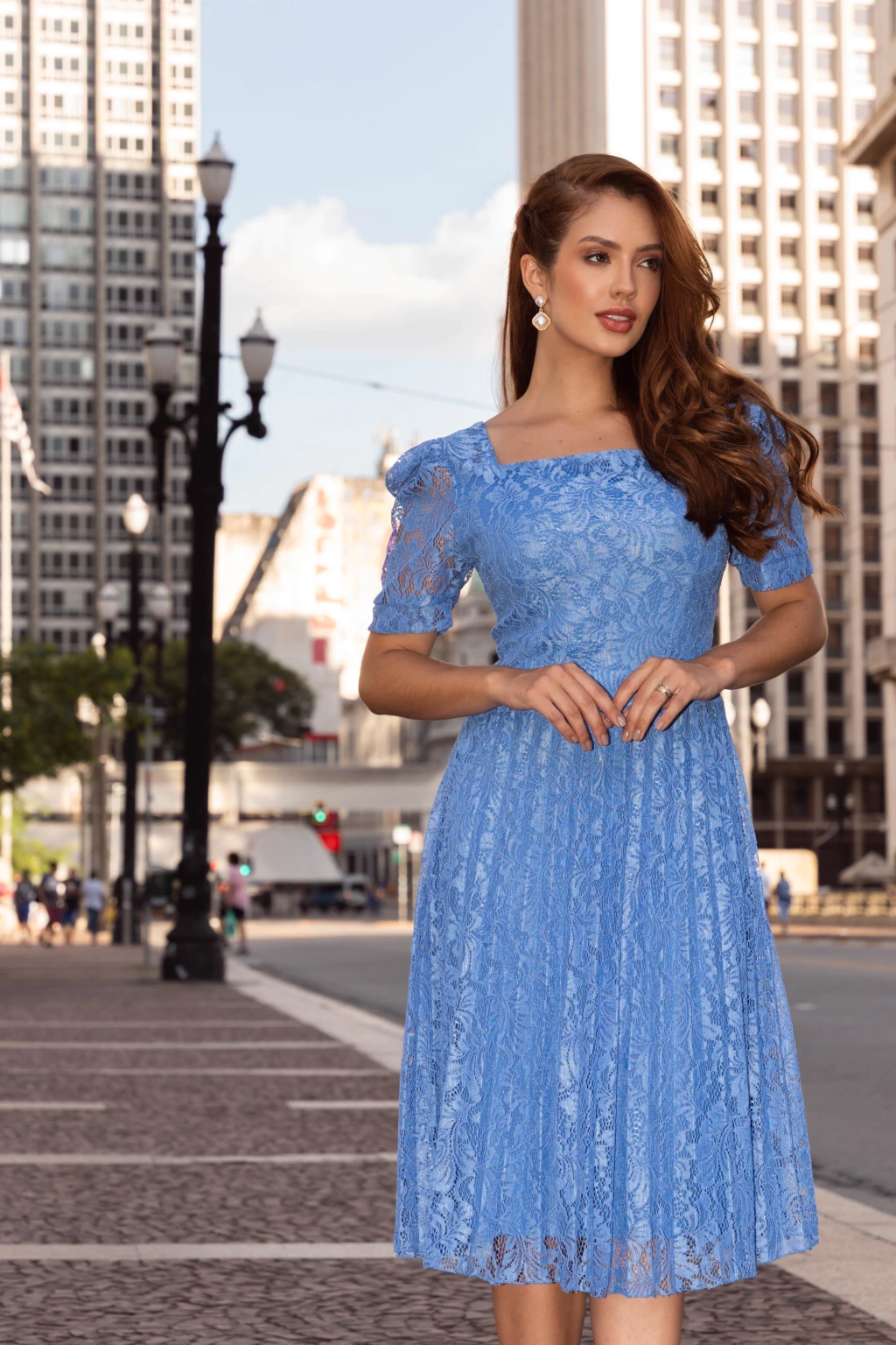 Romântico e sofisticado, este vestido midi de modelagem evasê é a escolha perfeita para quem busca elegância com um toque de delicadeza. A saia plissada traz leveza e movimento, criando um visual fluido e feminino. O decote quadrado valoriza o colo, enquanto as mangas curtas garantem conforto e versatilidade. Com fechamento por zíper nas costas e forro interno, proporciona um caimento impecável e confortável.